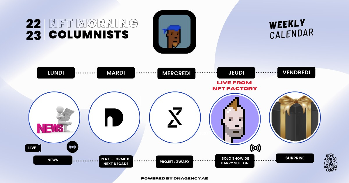 Comme chaque semaine retrouvez le résumé des émissions de la semaine passée, l'agenda de cette semaine et notre revue de presse avec les dernières infos sur les NFT...